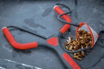 Verkrijgbaar in twee maten, klein en groot, voldoet deze katapult aan alle eisen die aan voeren en voertactieken worden gesteld. Geleverd met duurzame, bruingele en holle elastieken.